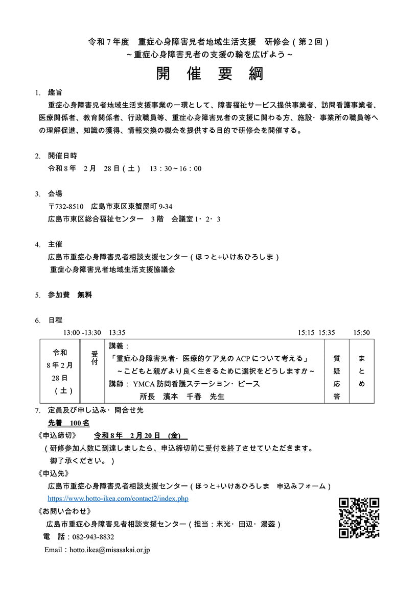 広島市東区総合福祉センター 3階 会議室1・2・3内容 講義:「重症心身障害児者・医療的ケア児のACPについて考える」